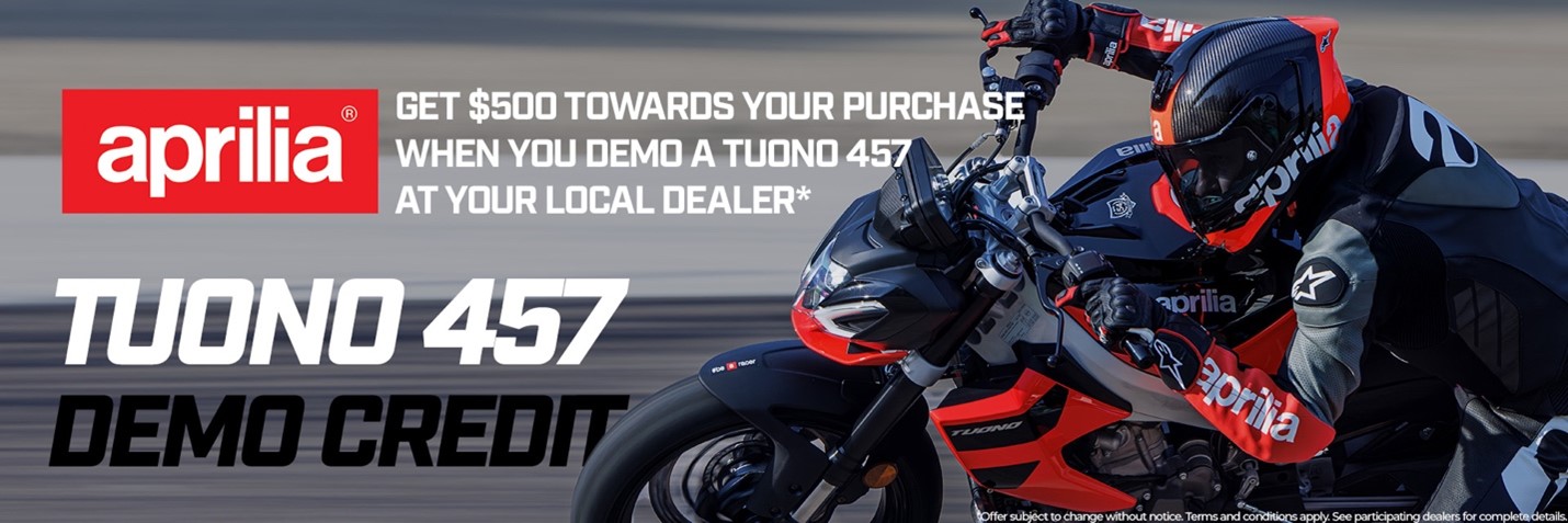 *Offer valid only on the purchase of new and unregistered Aprilia Tuono 457 motorcycles through participating authorized Aprilia dealerships. Customer must complete all eligibility requirements, including demo ride, registration submission within dealership, and warranty registration through dealership, to receive the $500 discount. Discount is applied at the time of purchase through dealership invoice and is not redeemable for cash or transferable. Offer valid 12/01/25 – 12/31/25, and cannot be combined with any other promotions, incentives, or discounts. Aprilia and Piaggio Group reserve the right to modify or cancel this promotion at any time without prior notice. Other restrictions may apply. See your authorized dealer for full details.