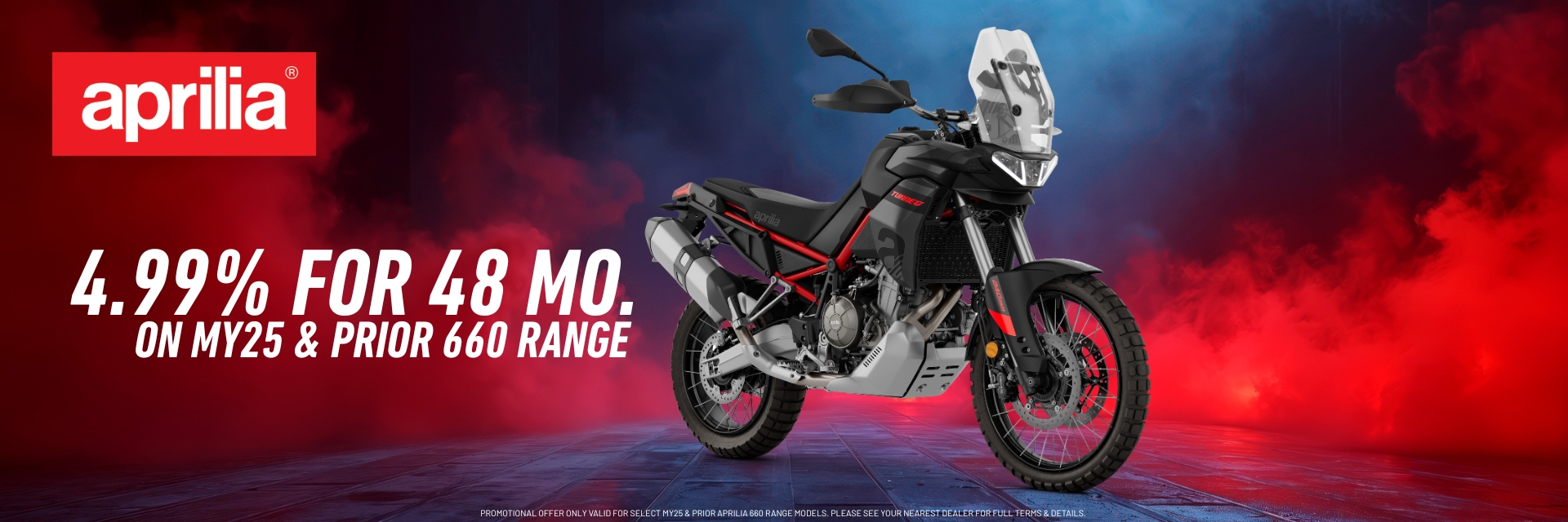 3 4.99% for 60 Months [4.99% APR*] Installment Promo – *Example: On a purchase where the Amount Financed is $10,574, your Down Payment is $1,175, with 60 monthly payments of $199.50 each. Interest Rate is 4.99% [ANNUAL PERCENTAGE RATE 4.99% (E)]. Note: The above financing programs are offered by Synchrony Bank. Subject to credit approval. Approval, and any rates and terms provided, are based on credit worthiness. Other financing offers are available. See your local dealer for details. Minimum Amount Financed $2,500; Maximum Amount Financed $50,000. Other qualifications and restrictions may apply. An origination fee of $125.00 will be added to the amount financed in the above example. Financing promotions void where prohibited. Offer effective on eligible and qualified MY25 & Prior 660 models from a participating Synchrony dealer. The $6,120 Amount Financed is estimated with qualified MY25 Aprilia RS 660 models with a MSRP $11,749 minus $1,175 Down Payment (10%). Amount Financed excludes taxes, title, and license fees. Other fees may apply. See dealer for product eligibility and qualifications between 01/01/2026 and 03/31/2026. Offer subject to change without notice. ["E" means estimate.]