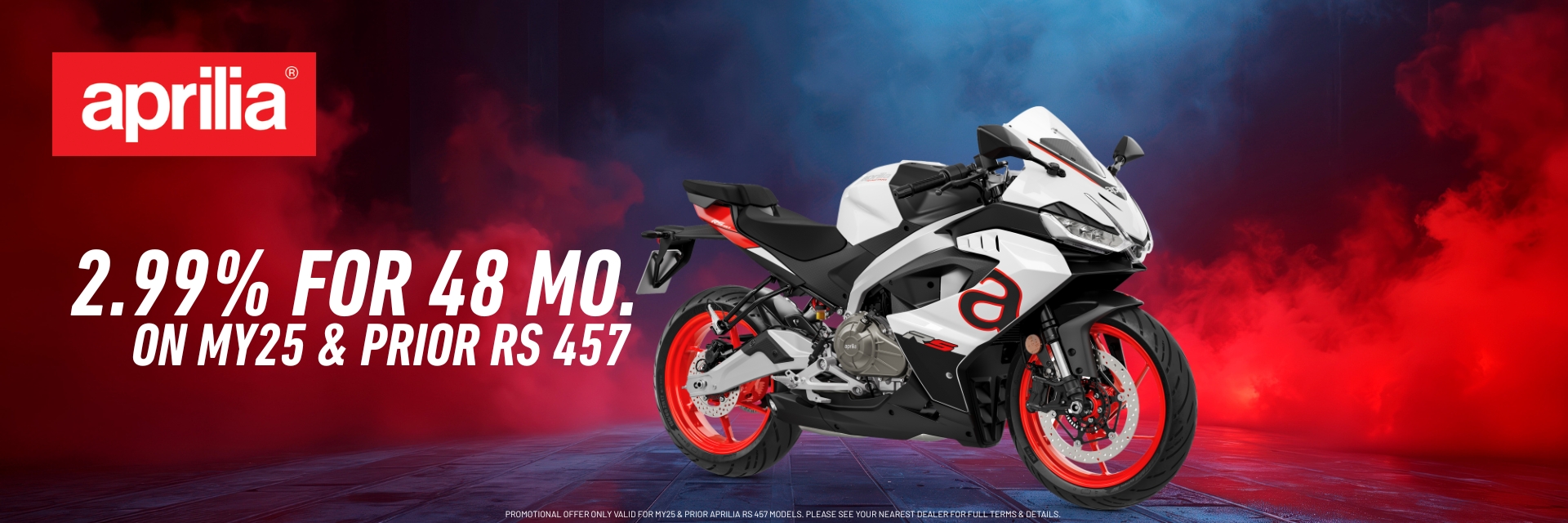 2 2.99% for 48 Months [2.99% APR*] Installment Promo – *Example: On a purchase where the Amount Financed is $6,120, your Down Payment is $679, with 48 monthly payments of $135.44 each. Interest Rate is 2.99% [ANNUAL PERCENTAGE RATE 2.99% (E)]. Note: The above financing programs are offered by Synchrony Bank. Subject to credit approval. Approval, and any rates and terms provided, are based on credit worthiness. Other financing offers are available. See your local dealer for details. Minimum Amount Financed $2,500; Maximum Amount Financed $50,000. Other qualifications and restrictions may apply. An origination fee of $125.00 will be added to the amount financed in the above example. Financing promotions void where prohibited. Offer effective on eligible and qualified MY25 RS 457 models from a participating Synchrony dealer. The $6,120 Amount Financed is estimated with qualified MY25 Aprilia RS 457 models with a MSRP $6,799 minus $679 Down Payment (10%). Amount Financed excludes taxes, title, and license fees. Other fees may apply. See dealer for product eligibility and qualifications between 01/01/2026 and 03/31/2026. Offer subject to change without notice. ["E" means estimate.]