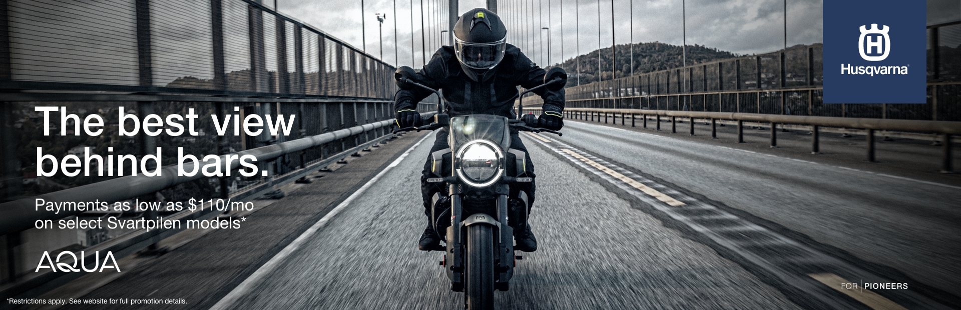 *Terms and Conditions: As low as 10.99% APR for up to 96 months on select new, untitled and unregistered 2024 Husqvarna street (2024: Husqvarna 401 Svartpilen) model motorcycles financed between January 1, 2026, through February 28, 2026, subject to change without notice. “As low as” assumes excellent credit history. Not all applicants will qualify. Example of monthly payment with no down payment required on $6,974 ($5,899 MSRP, $575 destination charges, and $500 average tax, title and other fees) over a 96-month term at 10.99% rate: $109.51 month. Destination charges and tax, title and other fees may vary. Rate and down payment based on credit approval criteria. Financing is through retail installment sales contracts offered by the selling Husqvarna dealer. Offer is subject to credit approval by Aqua Finance, Inc. Please see your authorized Husqvarna dealer for all program details.