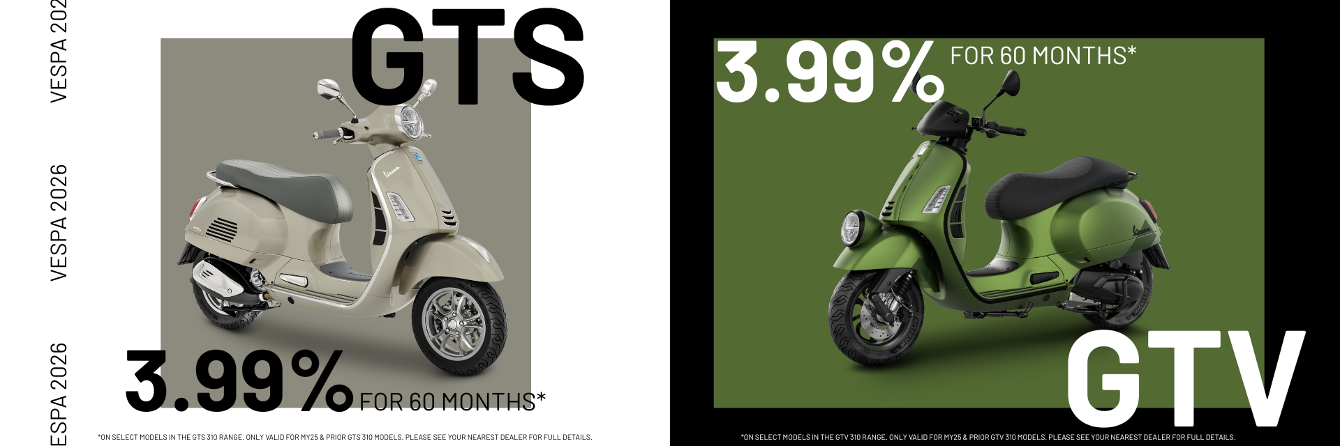 (3) 1.99% for 48 Months [1.99% APR*] Installment Promo – *Example: On a purchase where the Amount Financed is $3,960, your Down Payment is $439 with 48 monthly payments of $85.90 each. Interest Rate is 1.99% [ANNUAL PERCENTAGE RATE 1.99% (E)]. Note: The above financing programs are offered by Sheffield Financial, a Division of Branch Banking and Trust Company, Member FDIC. Subject to credit approval. Approval, and any rates and terms provided, are based on credit worthiness. Other financing offers are available. See your local dealer for details. Rate advertised is based on minimum bureau risk score of 660. Minimum Amount Financed $1,500; Maximum Amount Financed $50,000. Other qualifications and restrictions may apply. An origination fee of $125.00 will be added to the amount financed in the above example. Financing promotions void where prohibited. Offer effective on eligible and qualified Vespa MY25 & Prior Primavera 50 & 150, and MY25 & Prior Sprint 50 & 150 models from a participating Sheffield dealer. The $3,960 Amount Financed is estimated with qualified Vespa Primavera 50 MY25 with a MSRP $4,399 minus $439 Down Payment. Amount Financed excludes taxes, title, and license fees. Other fees may apply. See dealer for product eligibility and qualifications between 01/01/2026 through 03/31/2026. Offer subject to change without notice. [“E” means estimate.] (4) 3.99% for 60 Months [3.99% APR*] Installment Promo – *Example: On a purchase where the Amount Financed is $7,110, your Down Payment is $789 with 60 monthly payments of $130.91 each. Interest Rate is 3.99% [ANNUAL PERCENTAGE RATE 3.99% (E)]. Note: The above financing programs are offered by Sheffield Financial, a Division of Branch Banking and Trust Company, Member FDIC. Subject to credit approval. Approval, and any rates and terms provided, are based on credit worthiness. Other financing offers are available. See your local dealer for details. Rate advertised is based on minimum bureau risk score of 660. Minimum Amount Financed $1,500; Maximum Amount Financed $50,000. Other qualifications and restrictions may apply. An origination fee of $125.00 will be added to the amount financed in the above example. Financing promotions void where prohibited. Offer effective on eligible and qualified Vespa MY25 & Prior GTS and GTV models from a participating Sheffield dealer. The $7,110 Amount Financed is estimated with qualified Vespa GTS 300 MY25 with a MSRP $7,899 minus $789 Down Payment. Amount Financed excludes taxes, title, and license fees. Other fees may apply. See dealer for product eligibility and qualifications between 01/01/2026 through 03/31/2026. Offer subject to change without notice. [“E” means estimate.]