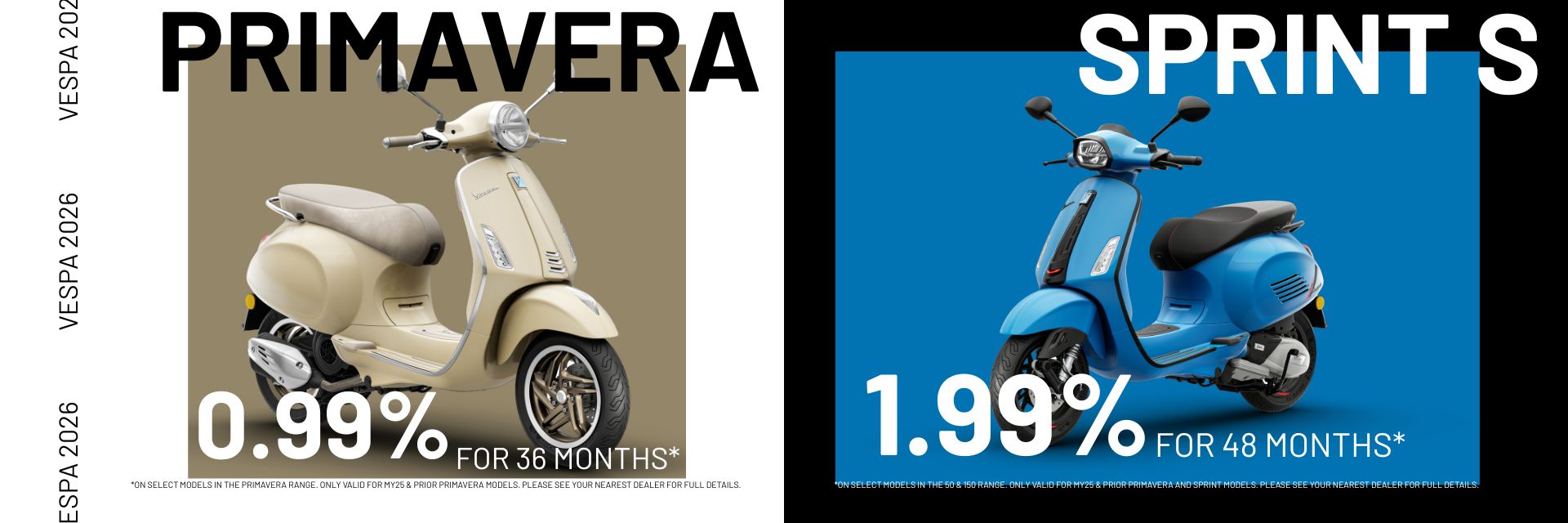 (1) 0% for 24 Months [0% APR*] Installment Promo – *Example: On a purchase where the Amount Financed is $5,895, your Down Payment is $654 with 24 monthly payments of $245.62 each. Interest Rate is 0% [ANNUAL PERCENTAGE RATE 0% (E)]. Note: The above financing programs are offered by Sheffield Financial, a Division of Branch Banking and Trust Company, Member FDIC. Subject to credit approval. Approval, and any rates and terms provided, are based on credit worthiness. Other financing offers are available. See your local dealer for details. Rate advertised is based on minimum bureau risk score of 660. Minimum Amount Financed $1,500; Maximum Amount Financed $50,000. Other qualifications and restrictions may apply. An origination fee of $125.00 will be added to the amount financed in the above example. Financing promotions void where prohibited. Offer effective on eligible and qualified Vespa MY23 & Prior Sprint Justin Bieber and MY23 & Prior Elettrica models from a participating Sheffield dealer. The $5,895 Amount Financed is estimated with qualified Vespa Sprint Justin Bieber 150 MY23 with a MSRP $6,549 minus $654 Down Payment. Amount Financed excludes taxes, title, and license fees. Other fees may apply. See dealer for product eligibility and qualifications between 01/01/2026 through 03/31/2026. Offer subject to change without notice. [“E” means estimate.] (2) 0.99% for 36 Months [0.99% APR*] Installment Promo – *Example: On a purchase where the Amount Financed is $3,960, your Down Payment is $439 with 36 monthly payments of $111.69 each. Interest Rate is 0.99% [ANNUAL PERCENTAGE RATE 0.99% (E)]. Note: The above financing programs are offered by Sheffield Financial, a Division of Branch Banking and Trust Company, Member FDIC. Subject to credit approval. Approval, and any rates and terms provided, are based on credit worthiness. Other financing offers are available. See your local dealer for details. Rate advertised is based on minimum bureau risk score of 660. Minimum Amount Financed $1,500; Maximum Amount Financed $50,000. Other qualifications and restrictions may apply. An origination fee of $125.00 will be added to the amount financed in the above example. Financing promotions void where prohibited. Offer effective on eligible and qualified Vespa MY25 & Prior Primavera 50 & 150 models from a participating Sheffield dealer. The $3,960 Amount Financed is estimated with qualified Vespa Primavera 50 MY25 with a MSRP $4,399 minus $439 Down Payment. Amount Financed excludes taxes, title, and license fees. Other fees may apply. See dealer for product eligibility and qualifications between 02/01/2026 through 02/28/2026. Offer subject to change without notice. [“E” means estimate.]